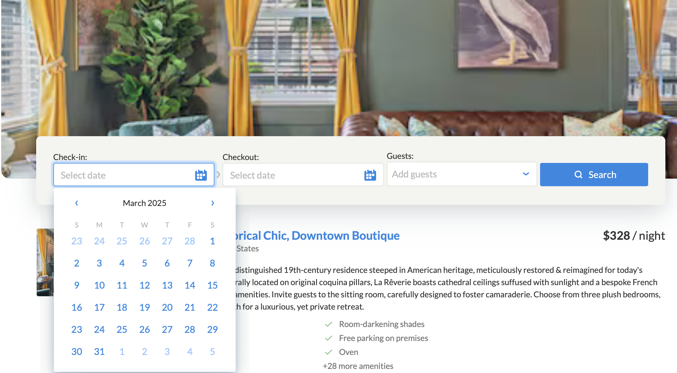 Of course, this doesn't work quite as well when there's only one listing in the website. If you only have one listing, then the INITIAL landing page search is completely inaccurate, which shows EVERY DATE AVAILABLE in the calendar. A guest would have to luckily guess what dates are occupied vs unoccupied. Please fix this so that someone with one listing, in that homepage search bar, shows VRBO, AIRBNB occupied greyed out dates.